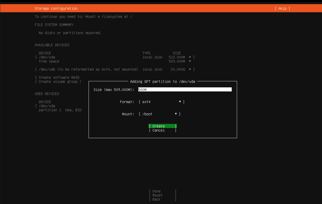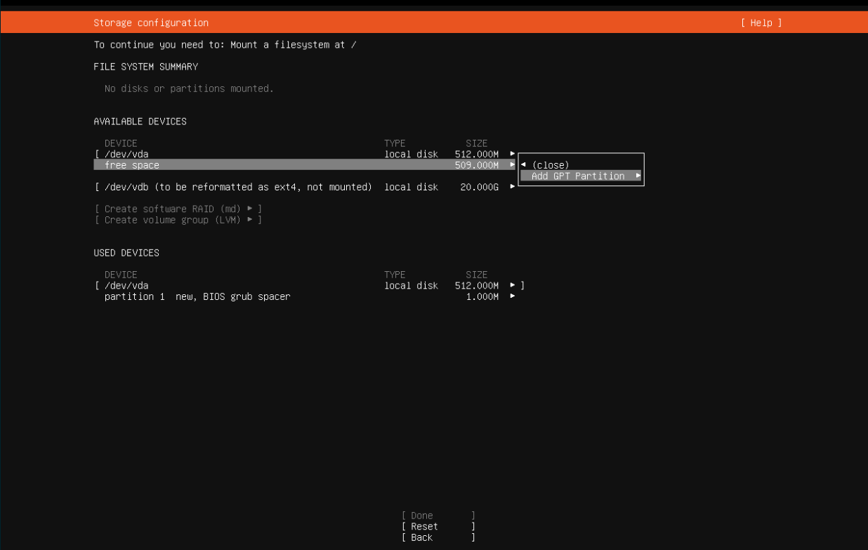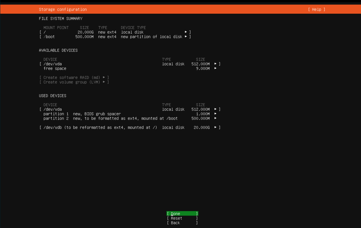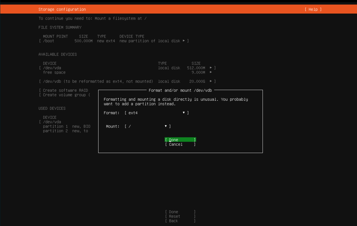 Then, select the larger disk where your operating system will be installed and format it as ext4 as / - that’s it!